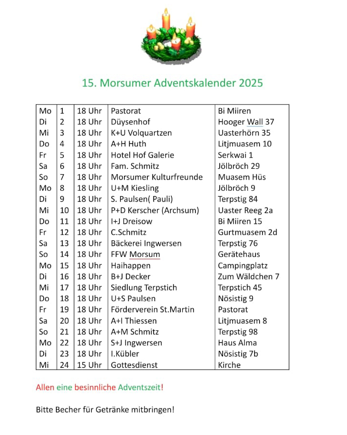 Liebe Morsumer und Morsumerinnen, liebe Gäste, liebe Unterstützer der Kirche St. Martin. Hier sind die aktuellen Termine des 15. lebendigen Morsumer Adventskalender. Wir freuen uns, Euch zu sehen.
