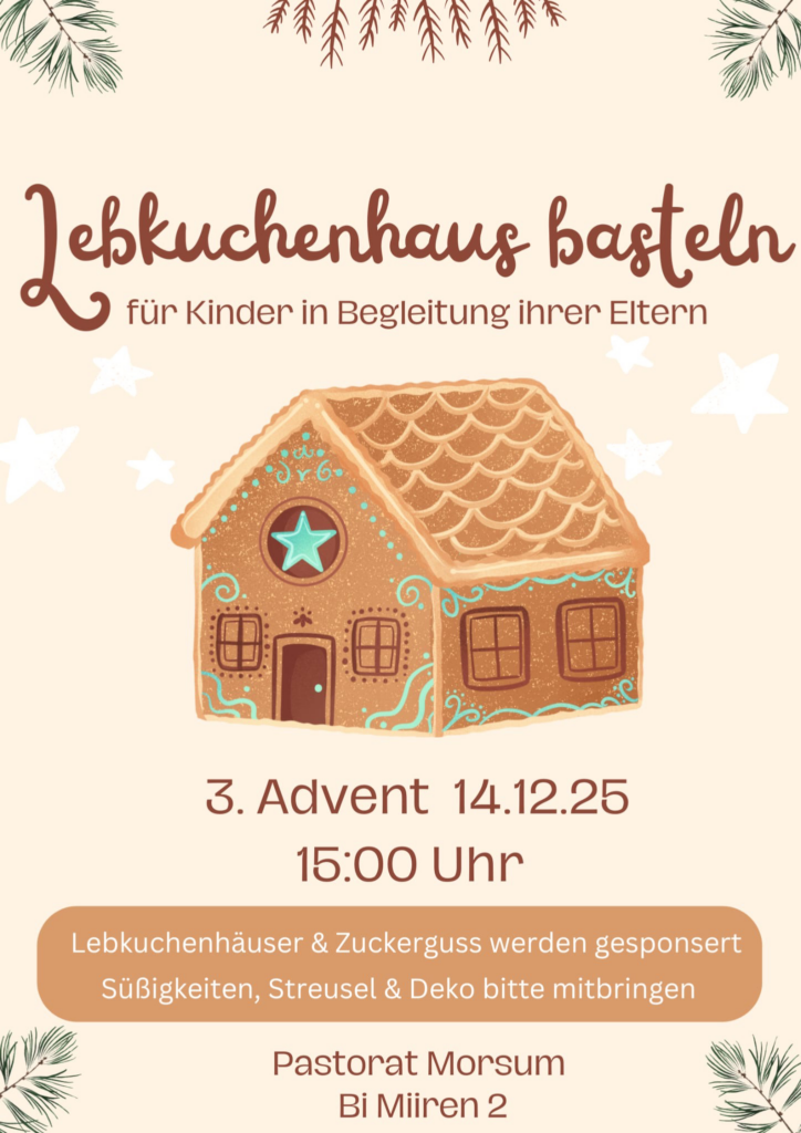 Liebe Kinder, liebe Eltern, mit Unterstützung des Kindergartens in Morsum wollen wir mit den Kindern am 3. Advent, dem 14.12.2025 ab 15 Uhr Lebkuchenhäuser selber bauen. Anmeldungen bitte an Bahne Schmidt: bahne.schmidt@gmail.com